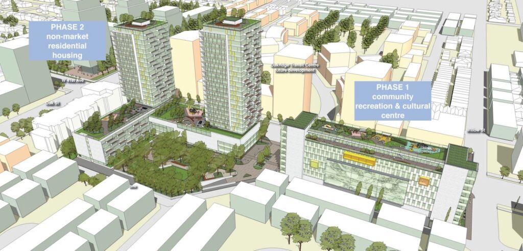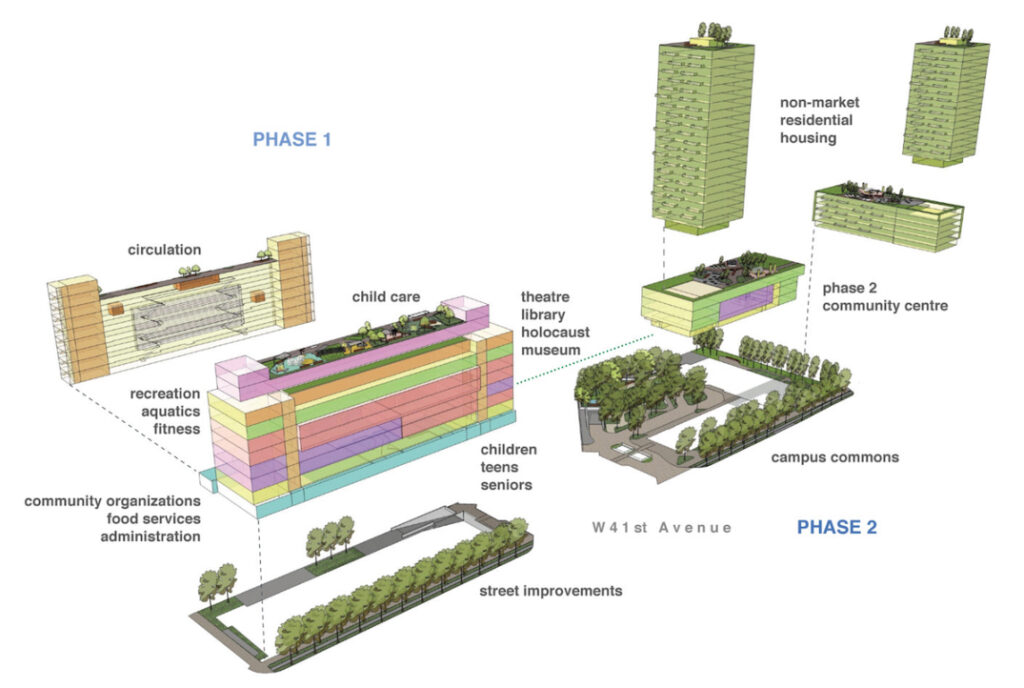 The first phase of this revitalized complex includes a new eight-storey community centre that will provide program and services for recreation, aquatic and fitness; theatre, library and holocaust museum; child care, pre-teens, teens and seniors; community organizations, food services and administration. It is being built on the existing surface parking lot, allowing the existing community centre and its programming to remain operational during construction.